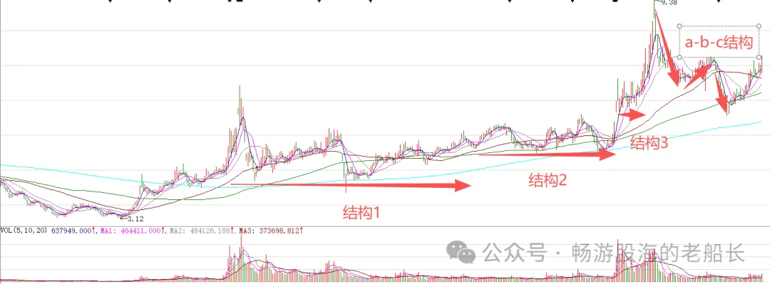 图中标注的大型中枢结构1,意味着股价处在大型的上涨趋势。结构2出现在结构1上轨附近,是为了蓄势突破结构1.两个结构的突破,宣告了波段上涨开始。结构3是结构1和结构2突破后的回踩,经历了中期a-b-c三段式调整后,现在中期调整已经结束,且小型结构突破,因此,接下来股价大概率走新的波段上涨走势。