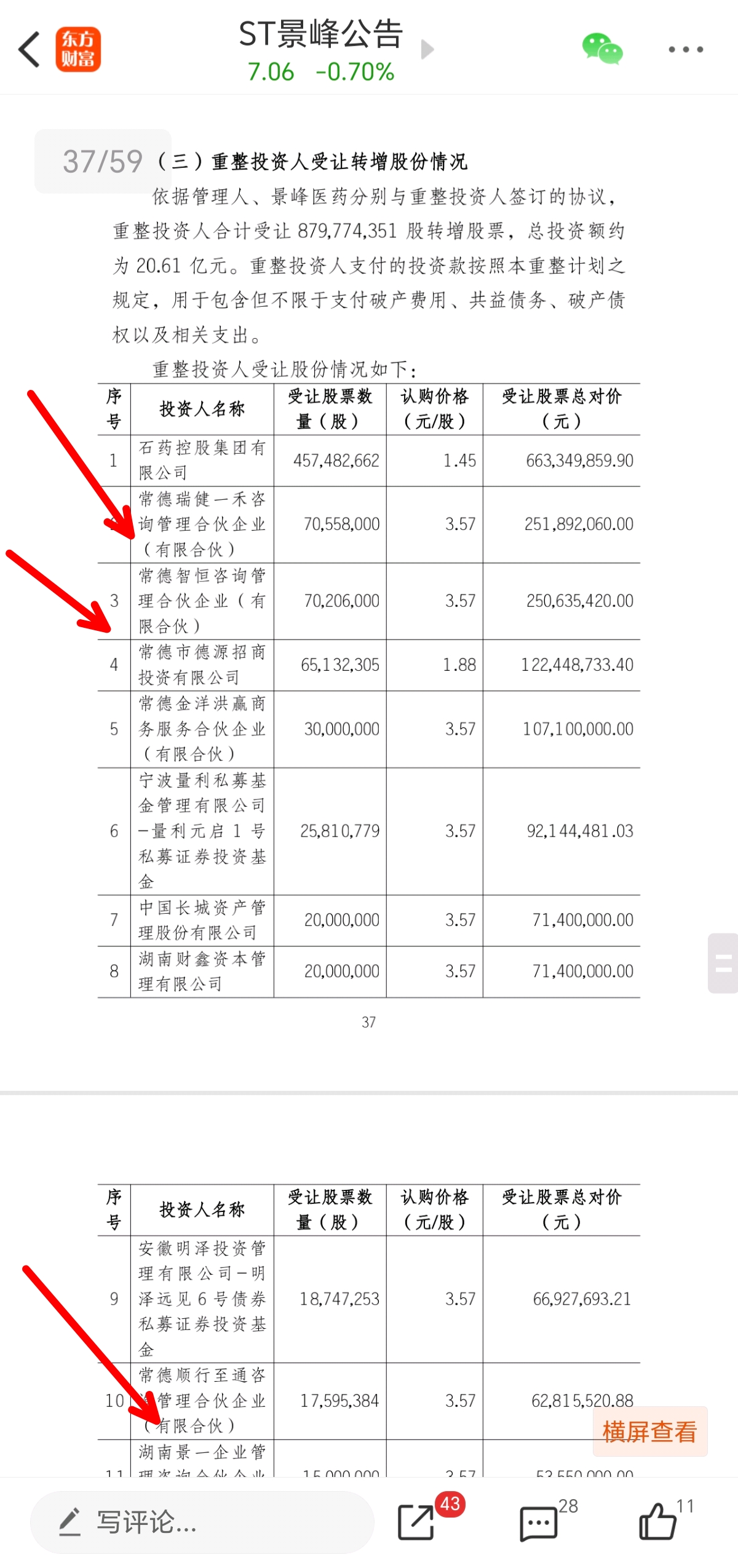 $ST景峰(SZ000908)$ 昨天有朋友谈到石药控股景峰只有26%股权问题,实际我看到还有9%隐藏到财投里边了,下边我把这三家贴出来,分别是常德瑞健 常德智恒 常德顺行 三家合计持股刚好9% ,三家几乎同一时间在常德注册,两家是2025.11.11 一家是2025.11.12,大家可以通过股权穿透看一下我这里就不发穿透图了 有两家和石药一起投资过很多公司 百分之百确定和石药是关联的 ,另外一家 大股东也是石家庄的一家财务公司 合伙人是一家新成立上海咨询公司 石家庄跑到常德又和石药关联两家公司同一时间在常德成立资产管理公司 这也大概率确定这家也是与石药关联。现在石药明里暗里其实控股35%股权 持股成本要比当初一元一股协议多出了太多。。今天说这些也不会对股价有啥影响 只当供大家作为投资参考。。
