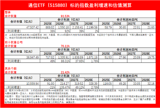 根据wind业绩前瞻预测,目前能统计到数据的成分股共计33只,合计权重91.53%。截至2026年4月22日,上述成分股合计市值为4.75万亿元,2025E/2026E/2027E/2028E合计净利润分别为808/1550/2158/2200亿元,分别yoy+36%/+92%/+39%/+2%。当前市值对应2025E/2026E/2027E/2028E年PE分别为58.79/30.65/22.01/21.60x。