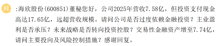 董秘尚未回复。主业与投资的平衡、金融资产的风险管理值得关注。