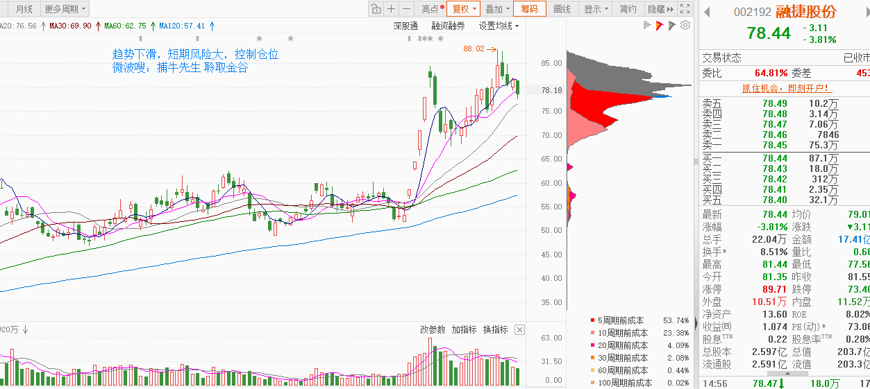 融捷股份$融捷股份(SZ002192)$:今开 81.35,最高 81.44,最低 77.56,收 78.44。盘前规则是9 点35前反抽不过82.5 就减,我执行了。大概在9点35到9点45这段,80.9到81.2一带先减掉一半;10 点后跌破我设的防守线79.8,再减一刀,只留一成跟踪仓。这票今天不是卖飞,是按弱修复票处理,先活下来再说。