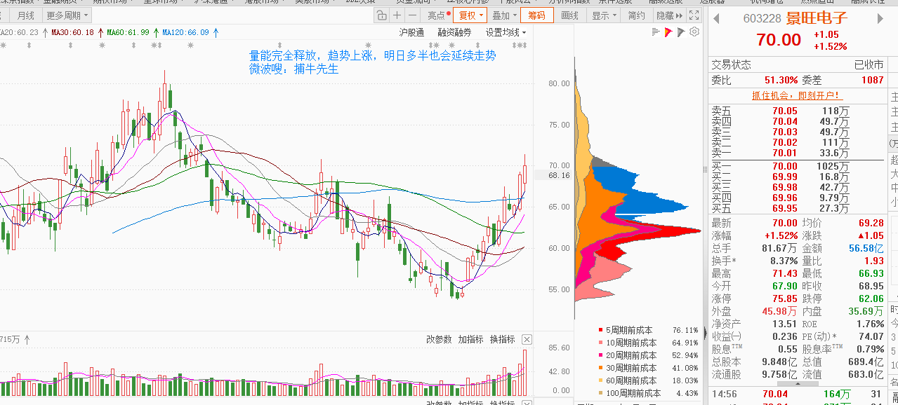 景旺电子$景旺电子(SH603228)$:今开67.90,最低66.93,最高71.43,收70.00。盘前规则是跌回67.5下方先护利润,重新站上 69.5 再看。9 点 35 前回落到 67.5 下方我先减一成锁利润;10 点前后重新站回 69.5 上方,在 69.6 到 69.9 把这部分补回,收盘继续持有。这票今天逻辑没变,还是趋势仓,不是情绪仓。
