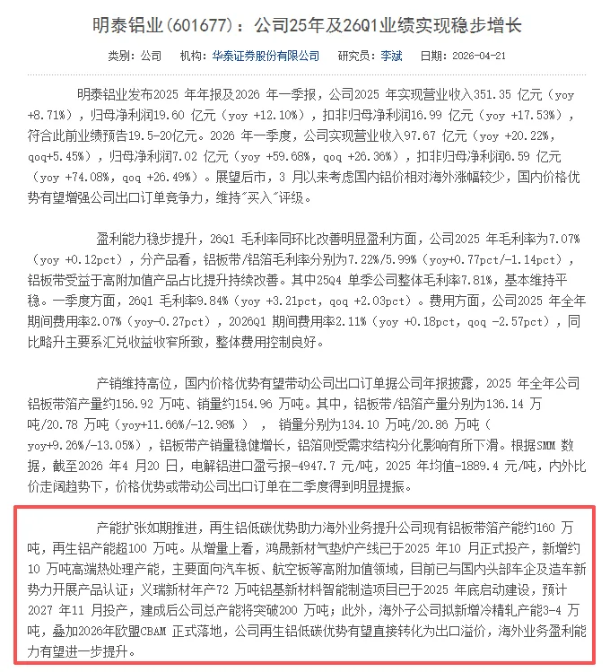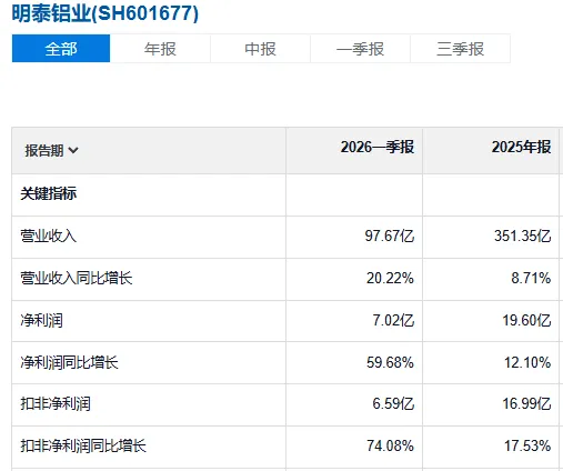 根据公司2025年年报,明泰铝业实现营业收入351.35亿元,同比增长8.71%;归母净利润19.6亿元,同比增长12.1%。更为亮眼的是2026年一季度,公司营收达97.67亿元,同比增长20.22%;归母净利润7.02亿元,同比大幅增长59.68%;扣非净利润更是增长74.08%。