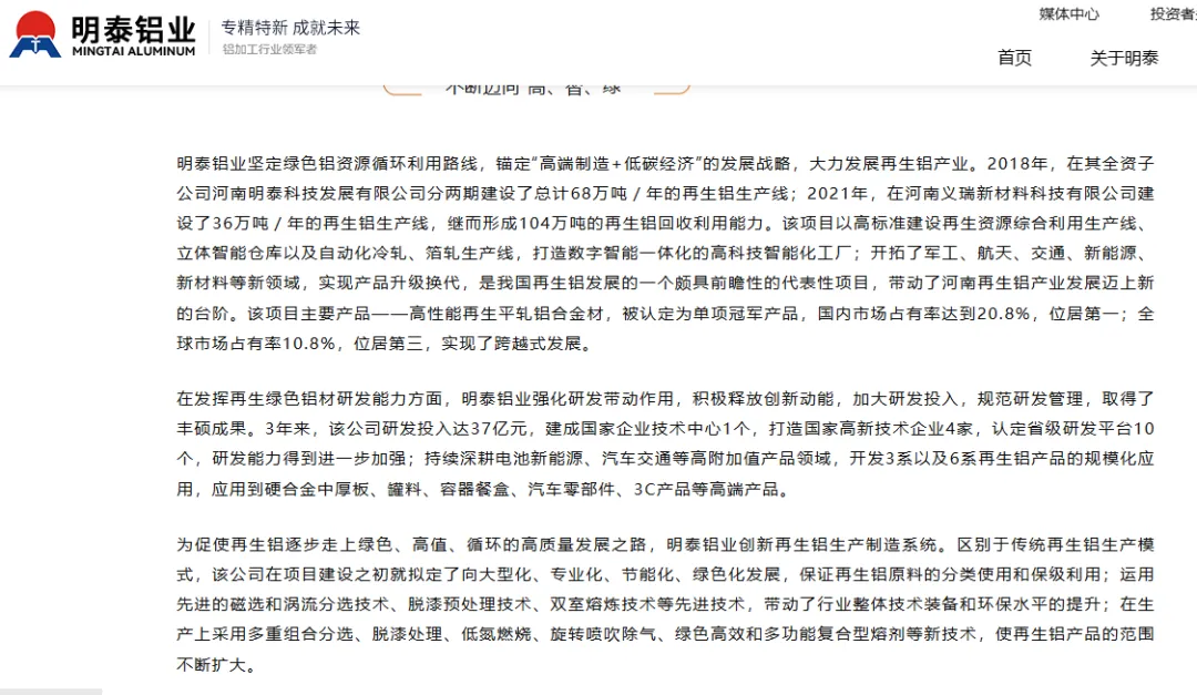 明泰铝业的核心护城河在于其国内领先的再生铝保级应用技术。公司已形成"废铝回收-熔炼再生-精深加工"完整产业链,再生铝处理能力达68万吨/年。更重要的是,公司拟引进激光诱导击穿光谱(LIBS)精分产线,可将再生铝应用拓展至对成分要求严苛的高端变形铝合金领域,打破再生铝只能用于低端铸件的技术瓶颈。