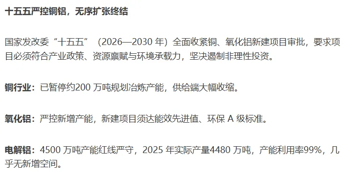 当前铝加工行业正经历深刻变革。供给端,国家发改委明确"十五五"期间严控新建铜、氧化铝项目,电解铝4500万吨产能红线已近触顶,2025年实际产量4480万吨,产能利用率达99%。这意味着行业彻底告别野蛮扩张,进入存量优化时代。