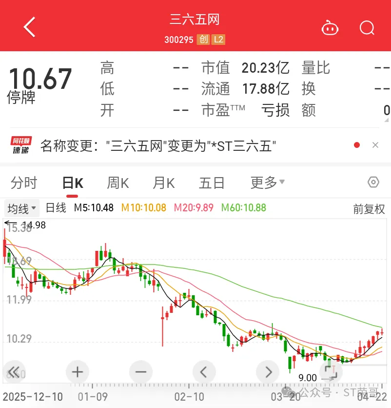 2026年4月22日,三六五网(300295)披露2025年经审计数据,扣除后营业收入 9927.91万元、归母净利润-5071.12万元,触及深交所《创业板股票上市规则》第10.3.1 条 “净利润为负且扣除后营收低于1亿元” 规定,股票自4月24日起被实施退市风险警示,简称变更为*ST三六。