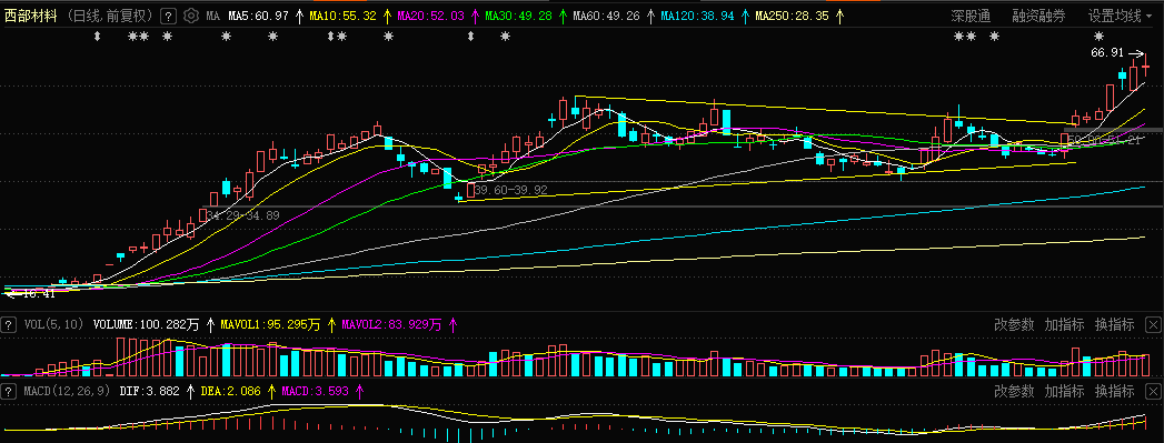 西部材料:这个票是我前天参与的,基本面上公司航天用铌合金为“长征火箭”“天宫空间站”及探月、探火工程提供关键原材料。此外今天是中国航天日启动仪式关键节点,看商业航天板块会不会有资金回流。技术面上,这个票目前日线macd红柱继续放大,不过kdj有收敛粘合的迹象。接下来这个票不管是横盘震荡还是继续往上都行,只要不跌破5天线就继续拿着。$西部材料(SZ002149)$