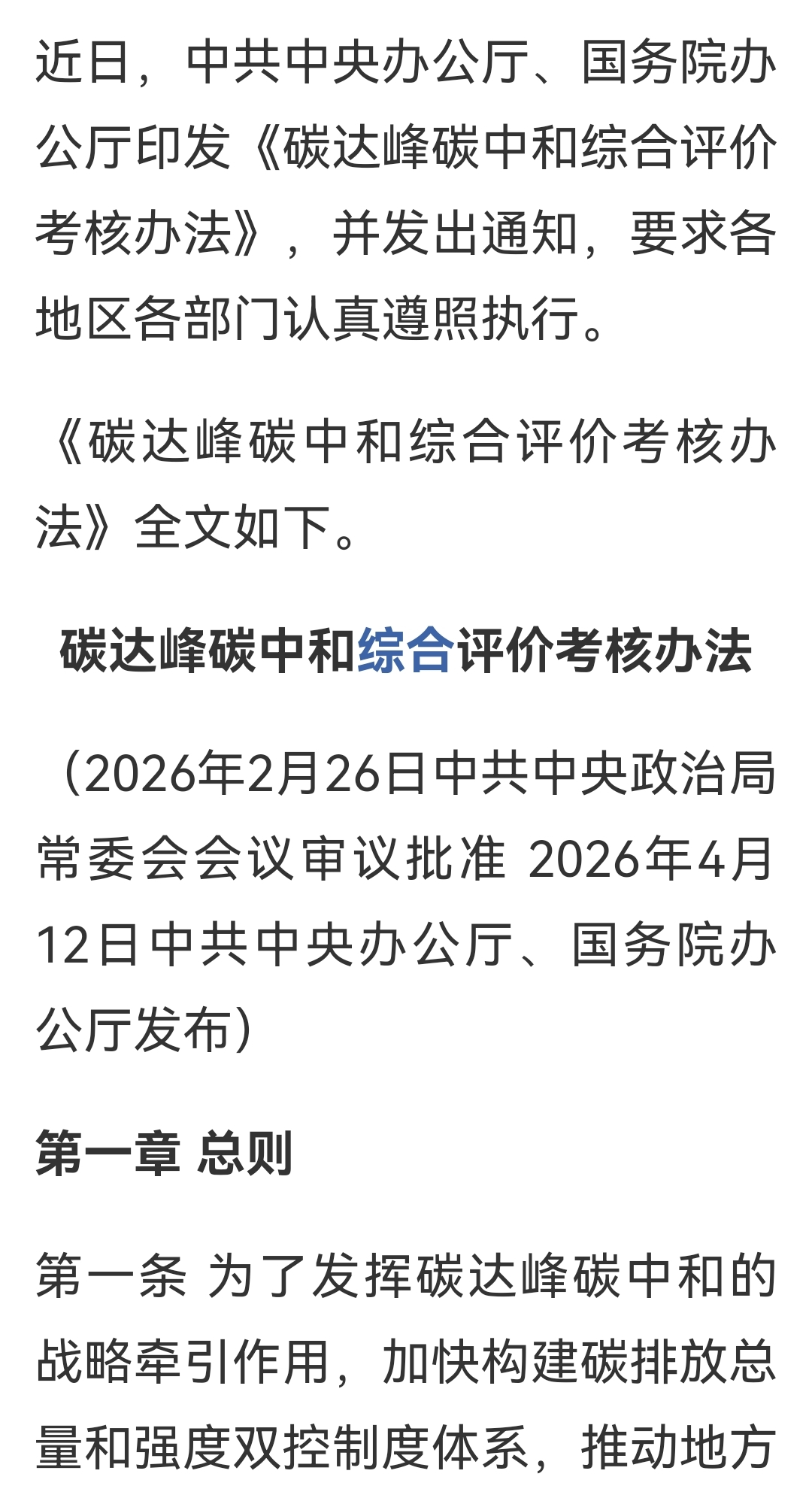 《碳达峰碳中和综合评价考核办法》全文如下。