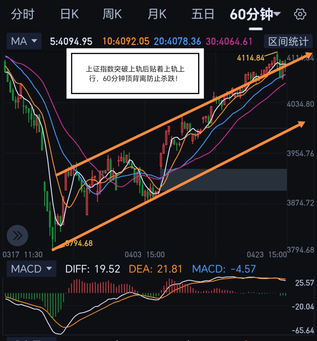 今天出去春游本来不想发帖了,早晨复盘并结合欧美下跌走势简单谈谈观点,总的来说谨慎一点半仓进可攻退可守。说明一下周末不再发帖了。消息面看,国内重要消息就是中办、国办印发《碳达峰碳中和综合评价考核办法》,这利好绿色电力,算电协同概念股票。中东局势信息,特朗普下令击沉任何在霍尔木兹海峡布设水雷的船只,美伊谈判的消息面真真假假、假假真真真的很难把握,昨晚一名伊朗外交消息人士23日告诉俄新社,伊朗与美国在巴基斯坦谈判的准备工作可能在“今晚或明天”取得突破。如果此消息属实,并且确定谈判取得实质性进展,签订长期停战协议的话,全球金融市场就会回到原有的趋势之中,我国股市当然也会回到原有上升通道之中,五月份大概率突破4300点。欧美股市全线下跌,但油价继续反抽,盘中一度涨幅超过5%,由此看来局势一时半会很难解决。只不过最近年报和季报业绩公布密集周期,操作上还是谨慎一点比较稳妥。大盘走势昨天早晨我预判说要防止冲高回落果然如此,为什么出现下跌?一方面因为周四魔咒日容易巨震,另一方面已经连续上涨积累大量获利盘,第三指数已经触及重压力区域,第四外围特不靠谱又变卦,第五月底年报、季报业绩集中披露,暴雷股票同时集中释放。第六就是五一小长假临近节日效应提前反应。