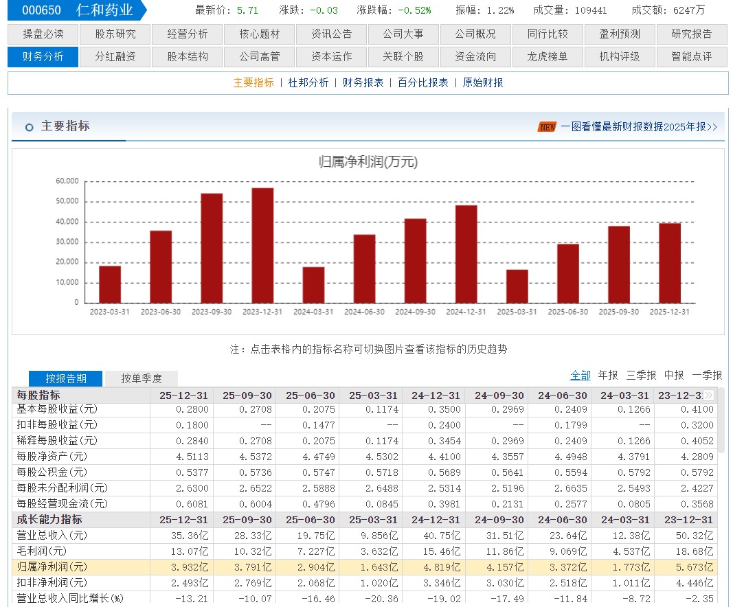 截至4月20日,仁和药业股东户数9.20万,较上期减少3.15%;人均流通股14471股,较上期增加3.25%。2025年1月-12月,仁和药业实现营业收入35.36亿元,同比减少13.21%;归母净利润3.93亿元,同比减少18.41%。