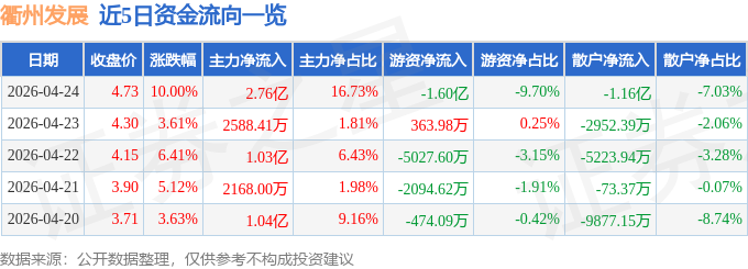证券之星消息,衢州发展4月24日涨停收盘,收盘价4.73元。该股于10点4分涨停,2次打开涨停,截止收盘封单资金为1.16亿元,占其流通市值0.29%。