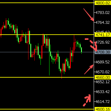 2、黄金昨晚冲太猛,下方回踩确认修正。或再试探4660的强支撑的可能,再守此位置看反弹,上方看4740范围内的震荡整理。
