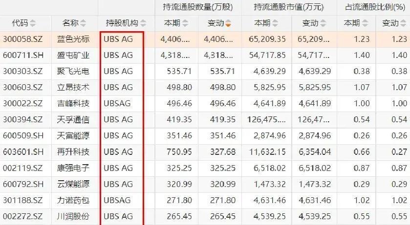 瑞银那边更直接,蓝色光标被新进4406万股,持仓市值6.5亿元,占流通股1.23%,盛屯矿业也被新进4318万股,持仓市值5.47亿元,另外还有华自科技、飞龙股份、依米康、飞力达、中电鑫龙,这一串名字摆出来,你会发现,它不是单押一条线,而是在AI营销、资源品、储能、汽车热管理、物流链条上同时落子。