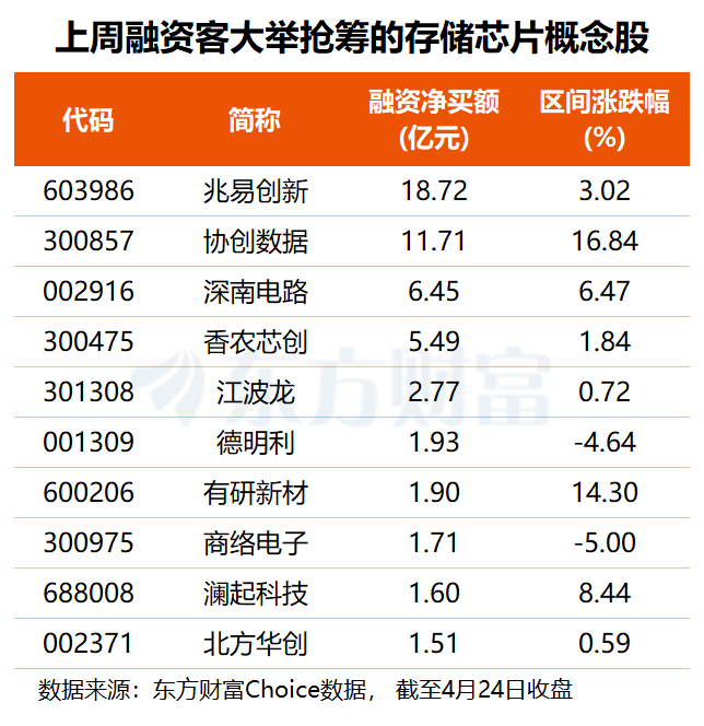 从资金角度看,东方财富Choice数据显示,上周共有多达61只存储芯片概念股获得融资净买入,其中16股获杠杆资金加仓超1亿元,兆易创新、协创数据分别获融资客“扫货”18.72亿和11.71亿元,深南电路、香农芯创、江波龙融资净买额分别为6.45亿、5.49亿、2.77亿元。