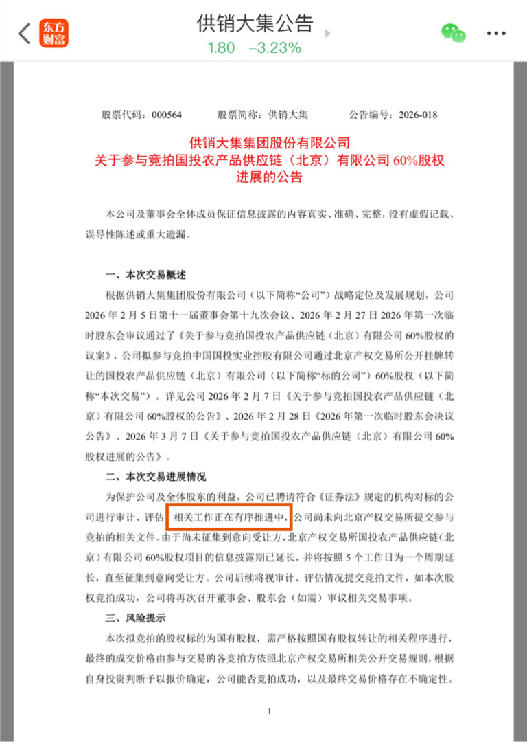 2月6日晚间,供销大集集团股份有限公司(以下简称“供销大集”)发布公告称,根据公司战略定位及发展规划,公司拟使用自有资金参与竞拍中国国投实业控股有限公司持有的国投农产品供应链(北京)有限公司(以下简称“国投农产品”)60%股权。国投农产品转让底价为9977.76万元。