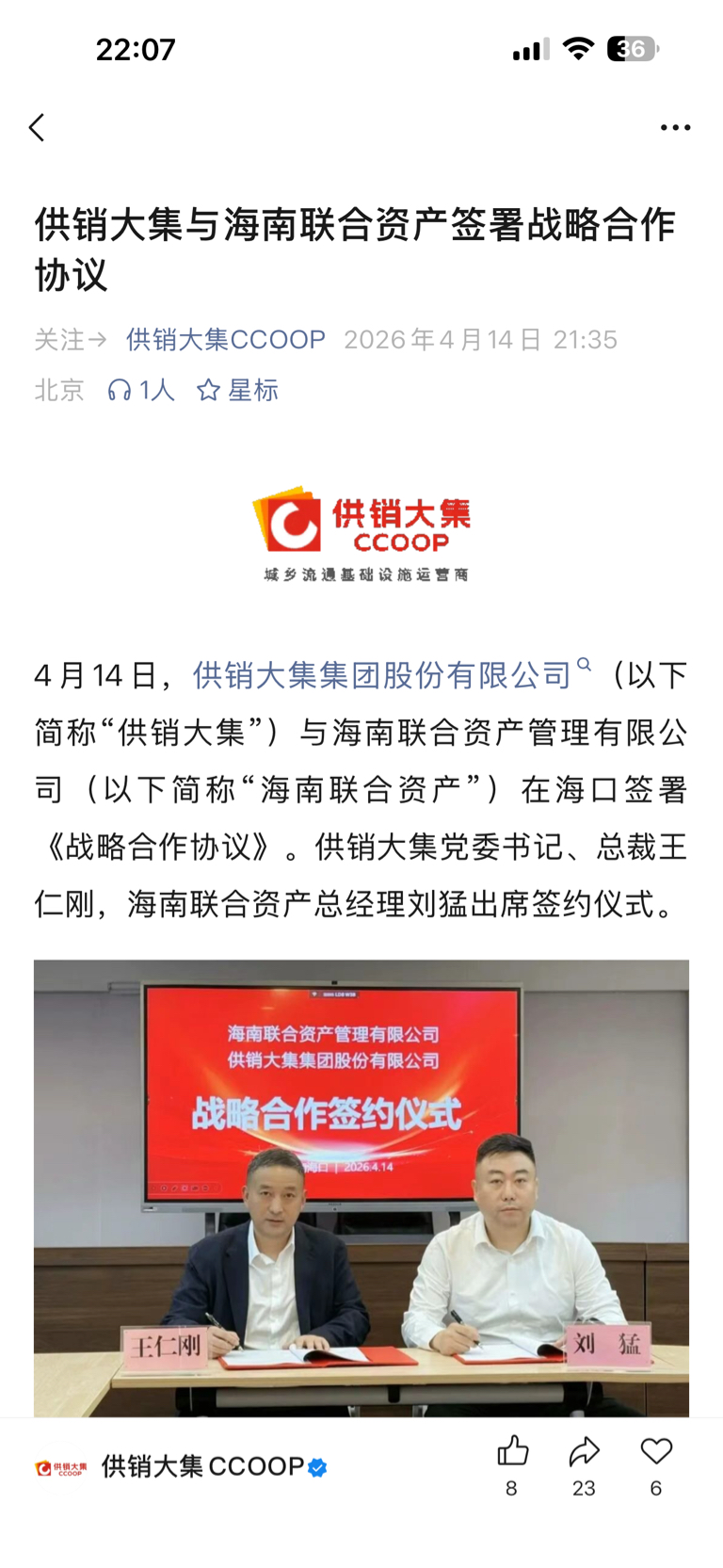 4月14日,供销大集与海南联合资产在海口签署战略合作协议。供销大集党委书记、总裁王仁刚,海南联合资产总经理刘猛出席签约仪式。作为海南首家地方资产管理公司,海南联合资产将与供销大集聚焦自贸港核心产业,深化农产品供应链及配套服务基地、免税商品供应链、存量资产盘活及商业运营等领域的合作;同时,共同探讨海南区域内的城市更新改造业务,推进城市功能的优化与协同发展。