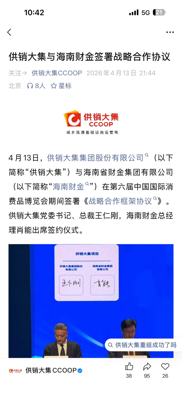 4月13日,供销大集与海南财金在消博会现场正式签署战略合作协议。供销大集党委书记、总裁王仁刚,海南财金总经理肖能出席仪式。作为省级国有金融资本投资管理平台,海南财金将与供销大集围绕资本合作、农产品供应链、免税消费业务及城市更新等四大领域开展资源互补合作,依托供销大集产业落地优势与海南财金金融创新能力,共同助力自贸港重点领域建设。
