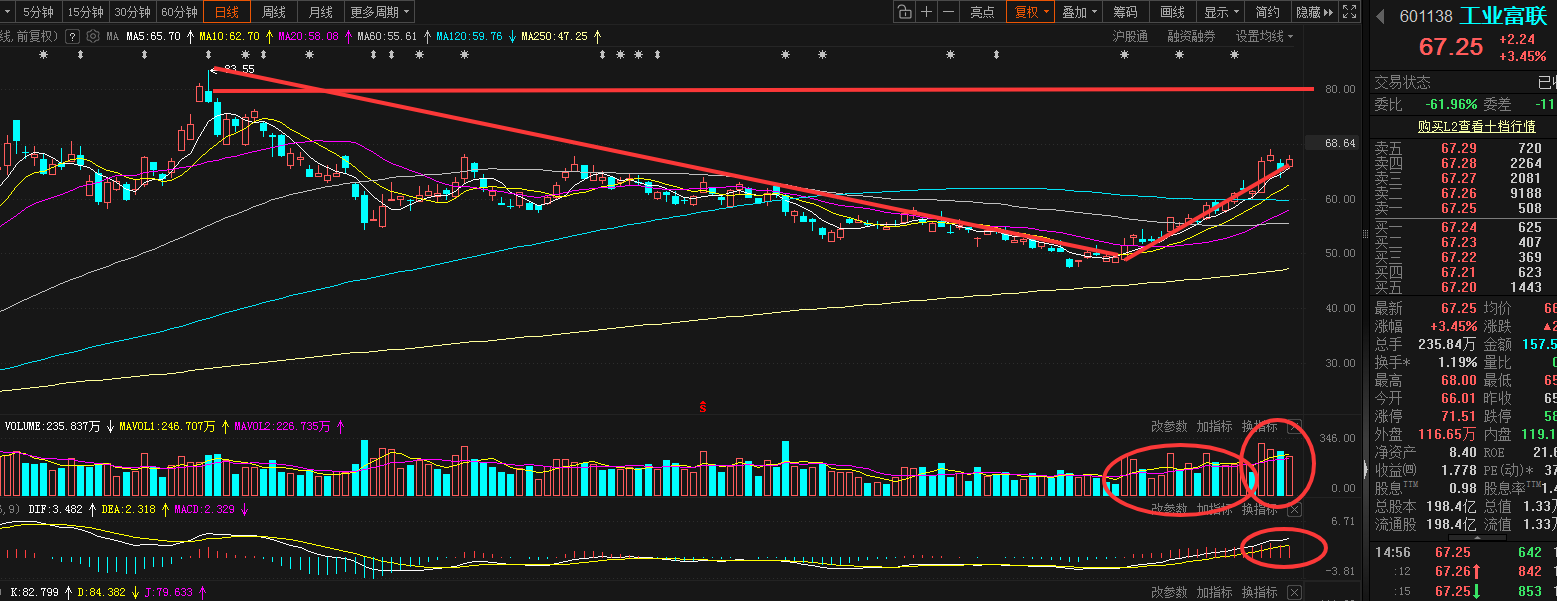 $工业富联(SH601138)$工业富联,昨日有点意外,本以为CPO龙头在连续出现主力纸金净流出的情况下,昨日CPO龙头大概率还会带来板块甚至大盘出现弱势回调。结果国产硬件强势回归,CPO部分龙头也企稳,甚至给到强势大涨。作为CPO和人工智能,消费电子的行业龙头,工业富联的热度也保持的非常不错。上周五宽幅调整后,回踩5日均线得到支撑。昨日高开在5日均线支撑附近,随后在国产替代强势回归的带动下,股价也走出稳步震荡攀升。但可惜量能并没有出现放大,这也就限制了整体高度。不过既然短中期均线已经多头排列跟上,且新的趋势已经形成,前期也是回调到之前大涨中位线水平。如此接下来继续期待走出时间换空间上行行情。策略上,短期目标可继续放在80附近。快速突破70,可适当考虑高减或高铁。宽幅调整,回踩10日均线可适当考虑低吸或低T。