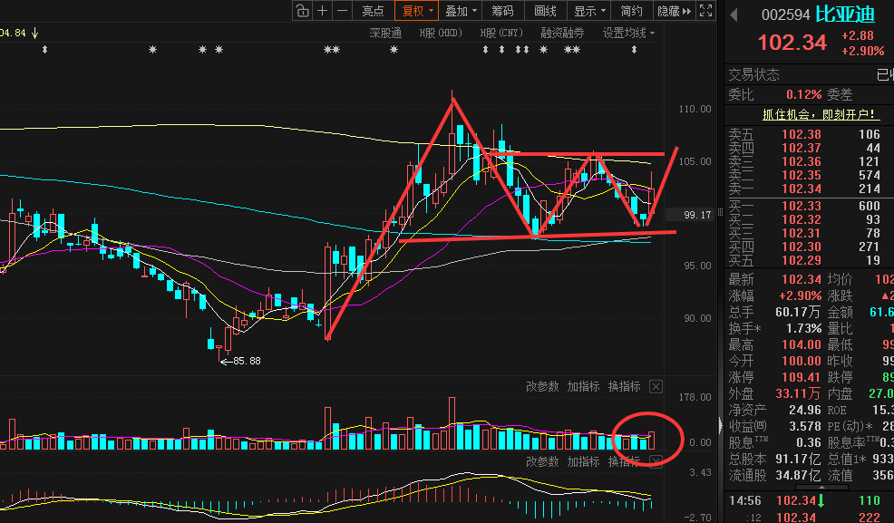 $比亚迪(SZ002594)$比亚迪,前六天可以说非常难受,所处的多个板块皆出现明显大涨,结果作为行业龙头,却连续弱势调整6天。不过虽然如此,但在文章中提到小时K线和日K都已经出现超卖,且量能已经来到阶段地量,这也就为继续看空动能会偏小,再加上已经来到60日和120日均线支撑附近,如此提醒可多保持些耐心,稍微放量给到中阳反包的概率还是会偏大。昨日表现还不错,直接高开,开盘后股价给到放量上攻,这也就为看涨动能在增强。但还是有点可惜,早盘冲高后,后续的三个小时,股价基本上都是保持横盘震荡,这也就意味后续继续强势看涨的动能偏弱。最终收出放量的带长上影的中阳。接下来就看量能是否能稳定,能稳定,这走出震荡上行问题不大。后续可期待在走出W底后,突破颈线位给到1:1等比上涨。短期目标还是一百一附近。策略上,如会给到宽幅调整,可适当考虑低吸或低T。突破年线压力,可适当考虑减仓或高T。