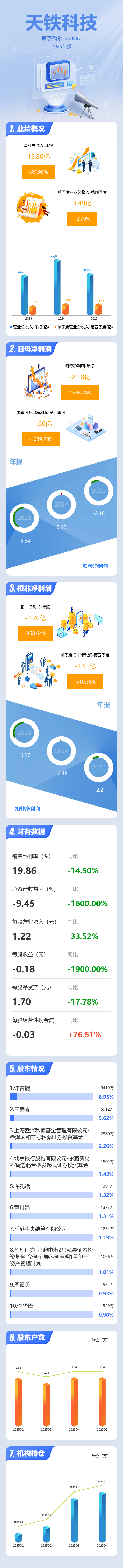 证券之星消息,天铁科技2025年年报显示,当年度公司主营收入15.8亿元,同比下降26.0%;归母净利润-2.18亿元,同比下降1535.78%;扣非净利润-2.2亿元,同比下降358.65%;其中2025年第四季度,公司单季度主营收入3.49亿元,同比下降2.79%;单季度归母净利润-1.6亿元,同比下降1689.29%;单季度扣非净利润-1.51亿元,同比下降610.39%;负债率63.71%,投资收益-94.19万元,财务费用7636.15万元,毛利率19.86%。