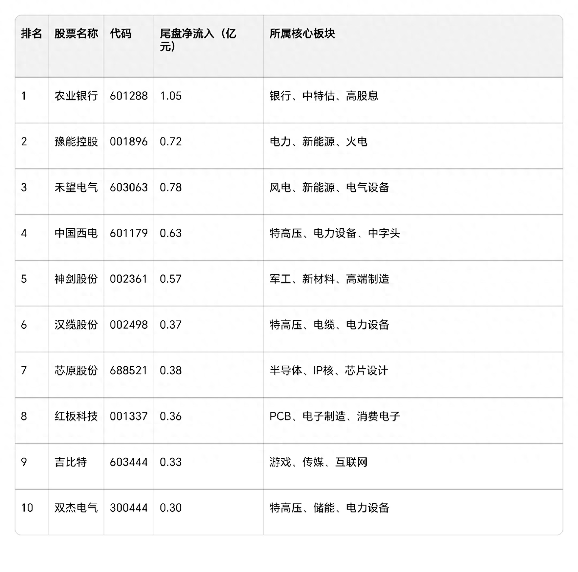 尾盘抢筹集中在银行、电力、特高压、低位科技/游戏,资金在节前做“高低切换+防御布局”,高位科技继续承压,低位蓝筹与电力主线更受青睐。