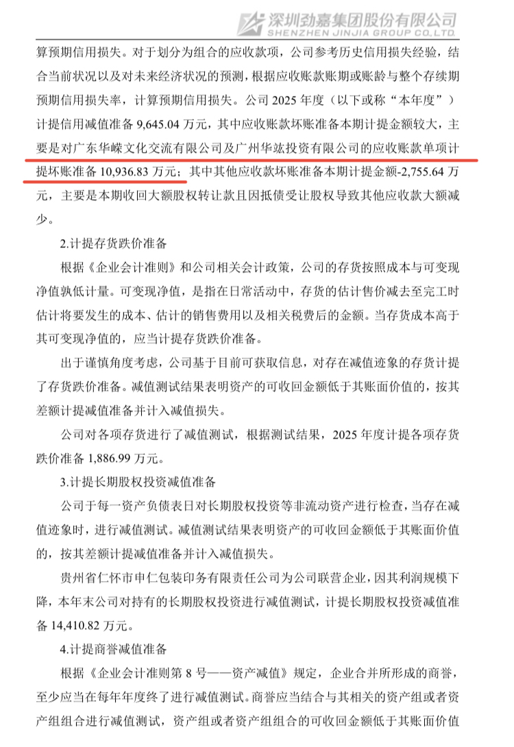 导语: 近日,深圳劲嘉集团股份有限公司(证券简称:劲嘉股份,证券代码:002191)发布《关于2025年度计提资产减值准备及预计负债的公告》。其中,对广州华竑投资有限公司(下称“广州华竑”)与广东华嵘文化交流有限公司(下称“广东华嵘”)合计高达3.9亿元的逾期应收账款,仅计提了10,936.83万元(约1.094亿元)的坏账准备,计提比例约为28.04%。这一处理引发市场广泛关注,其计提的充分性、合理性及是否符合《企业会计准则》的谨慎性原则,存在诸多疑问。