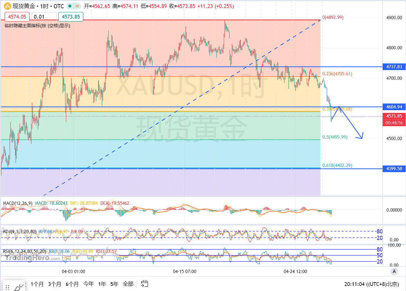 黄金今天连续向下突破4650美元以及4600美元支撑,下一步会跌倒哪里?