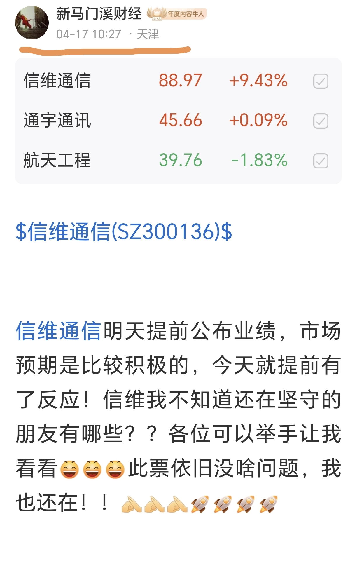 可见对于业绩不太如意的公司,咱们也得具体问题具体分析,而不是大家认为的业绩差了就一定要抓紧跑了,甚至有些主力还会利用散户的这种惯性思维,来进行一波故意的洗盘,接着没两天就直接爆拉把你彻底扔下车!当然我这里还是希望各位能提早向已经公布业绩且未来宏大又很有人气的个股进行倾斜,比如信维通信这种的。这种就属于确定性更高,也更敢于去持有的地方,所以我4月17日就早早发帖让大家进行关注了,现在回头看看,你即使在我发帖那天才关注到信维,那么到今天为止即使拿着不动,也有30个点的利润了,难道还不香吗??![憨笑 [憨笑]](http://gbfek.dfcfw.com/face/emot_default_28x28/emot27.png)