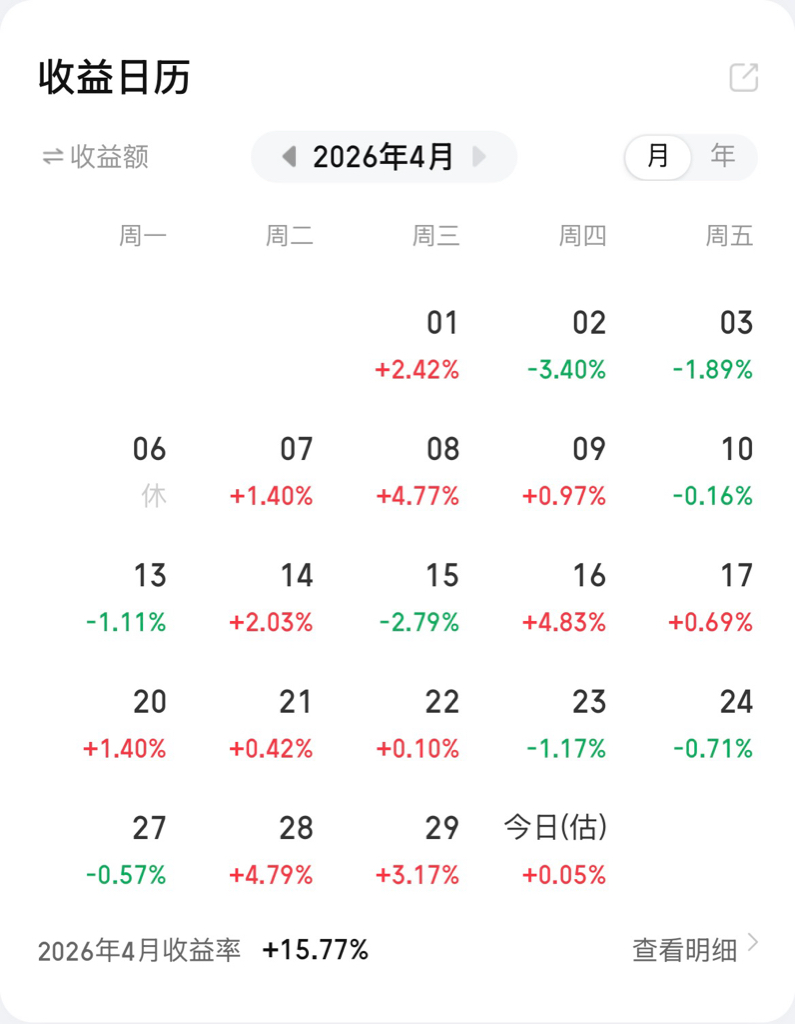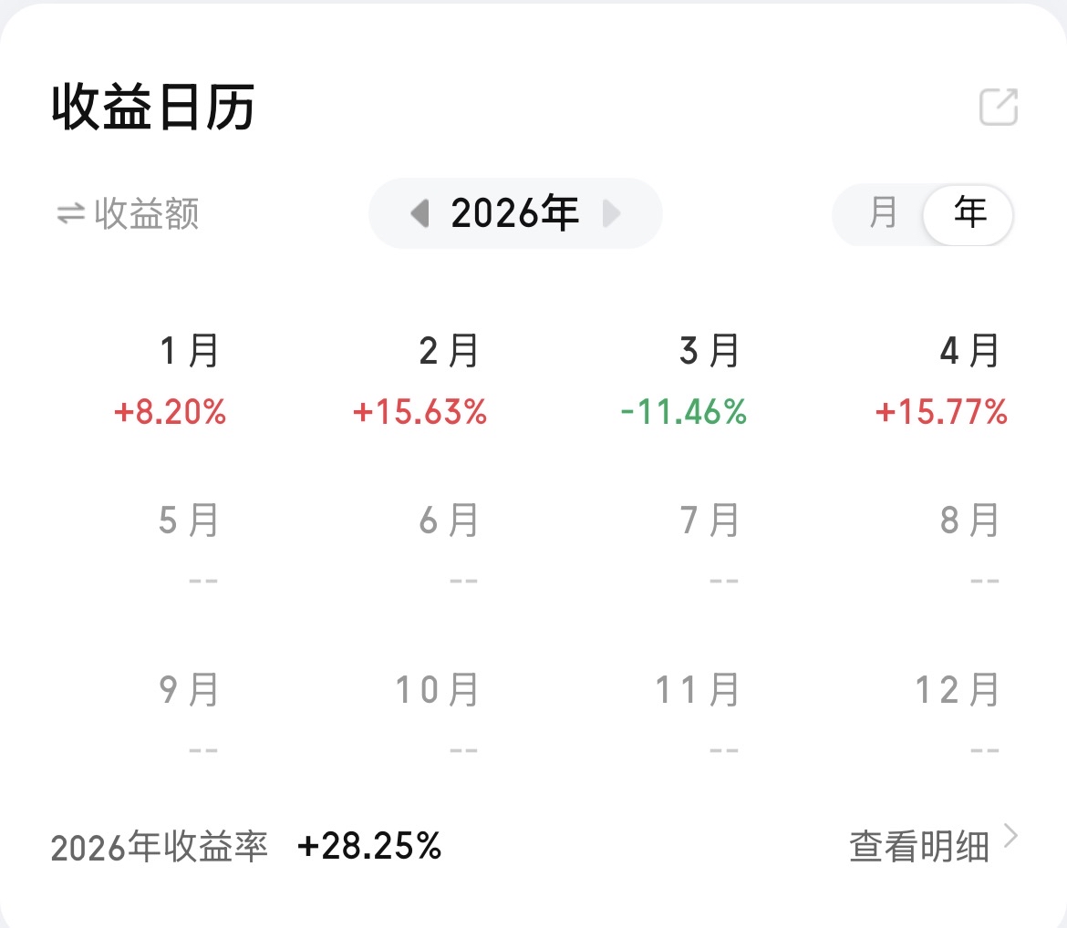 4月收官日盈利0.05%,4月整体盈利15.77%,2026盈利 28.25%。